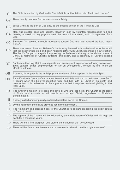 What we, at People's Church, Assembly of God believe is based on the foundational truths taught in the Bible. All of our teaching and ministry is rooted in and flows out of these biblical doctrines.